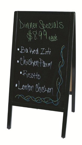 Dual Sided Sidewalk A-Frame Marker Boards Size: 20 1/4″ x 39.5″H Color: Mahogany Trim Includes: 4 Deluxe Markers (white, blue, yellow, red) & 1 easy wipe Eraser. A Frame Stand Mahogany Trim Premium durability Frame made of New Zealand Pine Great item for restaurants, wine and retail stores, coffee shops and bakeries.
