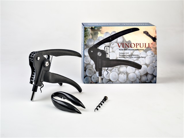 Remove the plastic or foil capsule with the foil cutter. Take the lever back into the open position. Gripping the bottle neck with the large handles, pull the large lever handle all the way backover the machine towards you to the closed position. The spiral is now fully inserted into the cork. The cork is removed from the bottle lifting the large lever handle all the way back to the original starting position.